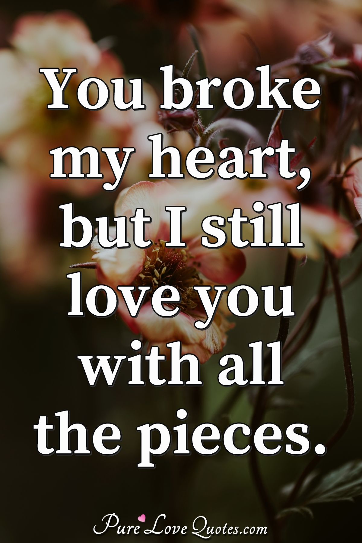 You Broke My Heart But I Still Love You With All The Pieces Picture Quotes from img.picturequotes.com "i broke my own heart loving you." "if someone won't lift a finger to call you, see you, and spend time with you, it's time for you to lift 5 fingers and wave goodbye." "forgot the mistake. You broke my heart, and shattered me into millions of peices. Broken heart quotes about having your heart broken into pieces and experiencing the terrible feelings that follow. You broke my heart, but i still love you with all the pieces. I am a strong person. Jan 23, 2019 · 108 relationship quotes about moving on. It takes a strong heart to love but it takes a stronger heart to continue to love after it's hurt. I still love you with all my heart, no matter what.